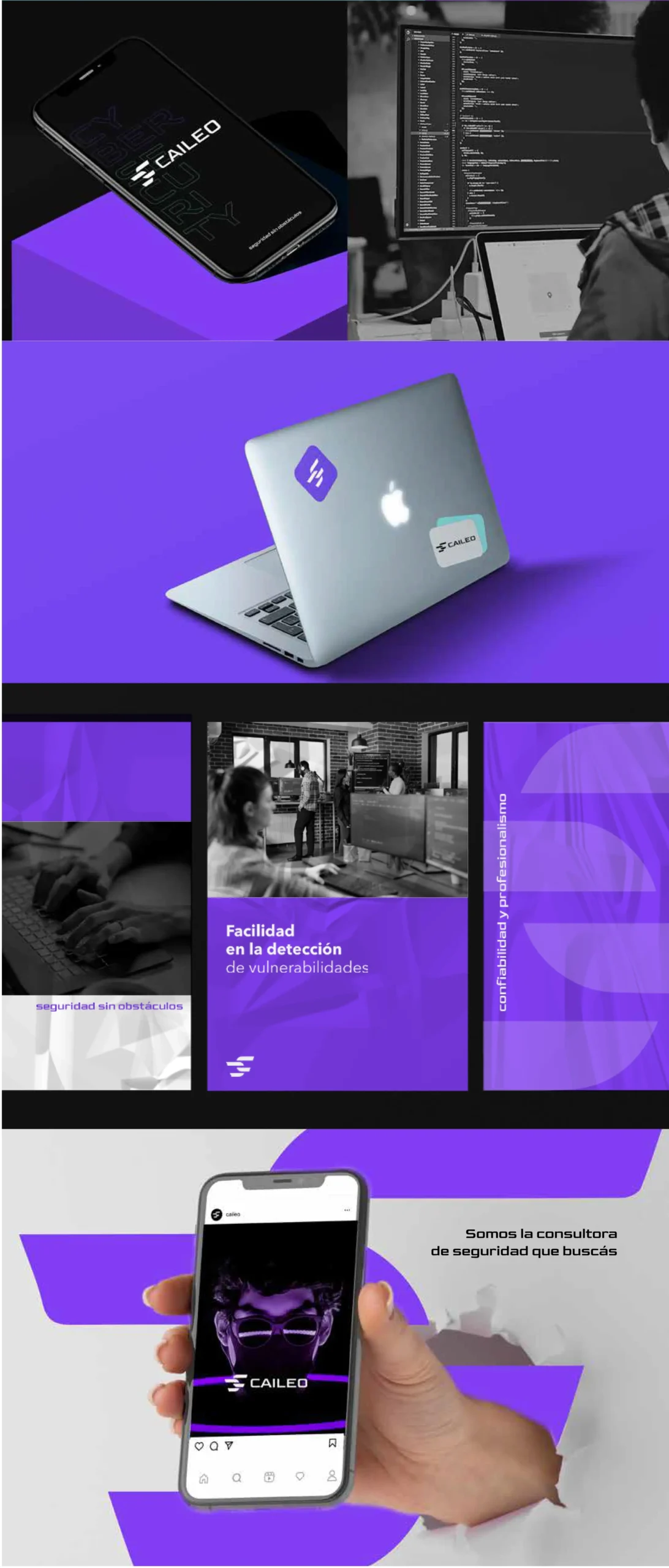 Branding completo para Caileo, consultora especializada en seguridad. Desarrollamos una identidad visual sólida y profesional, con un diseño pensado para transmitir confianza, protección y experiencia en el sector.