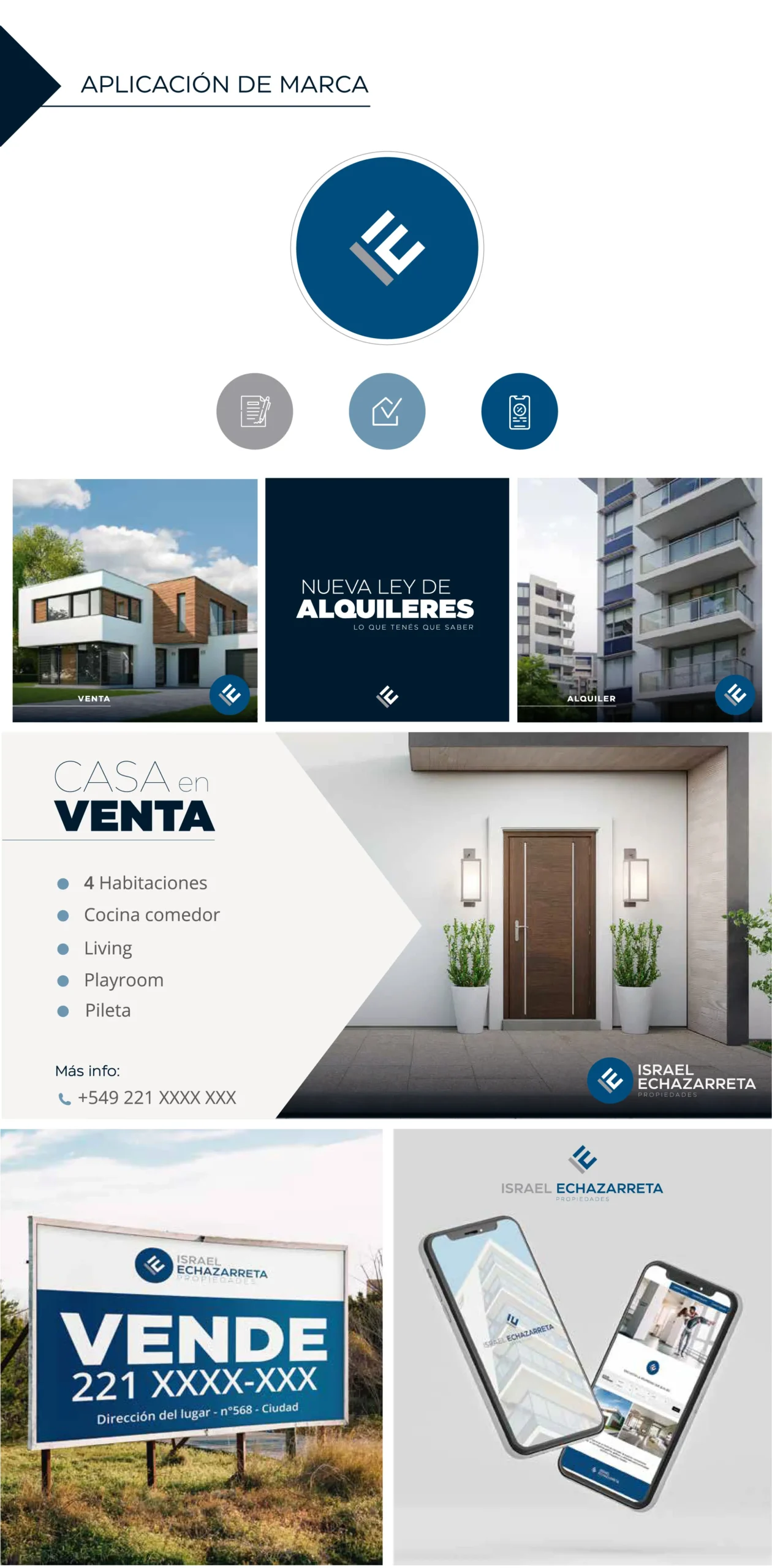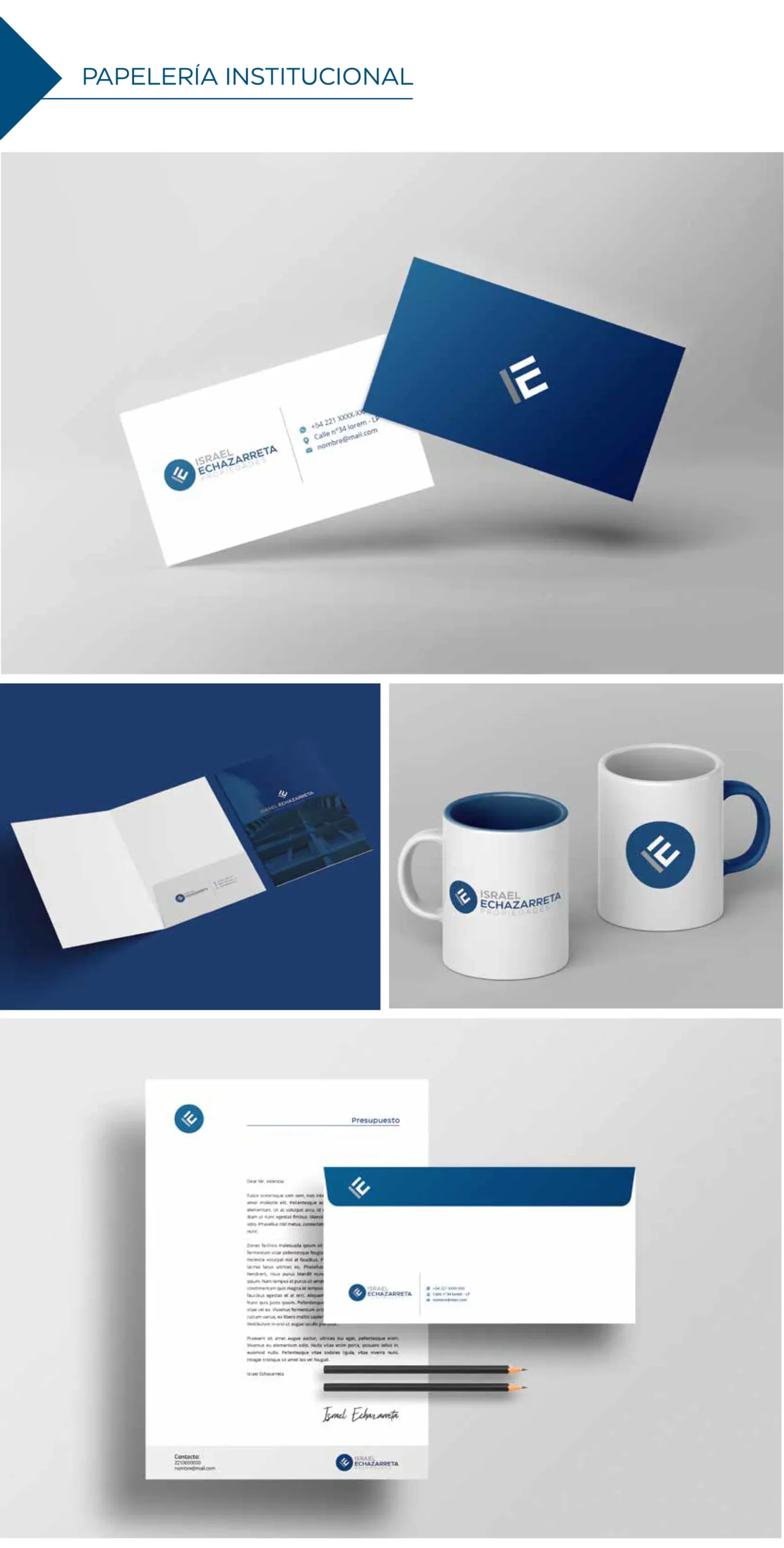 Branding completo para Israel Echazarreta Propiedades. Desarrollamos una identidad visual moderna y confiable para el rubro inmobiliario, con un diseño profesional pensado para posicionar la marca y atraer nuevos clientes.
